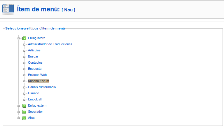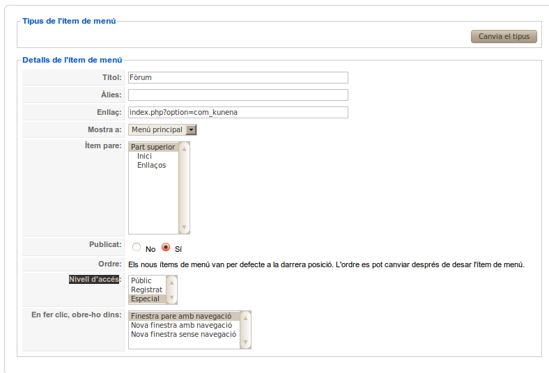 El següent pas es crear un ítem al menú principal per accedir al Fòrum: