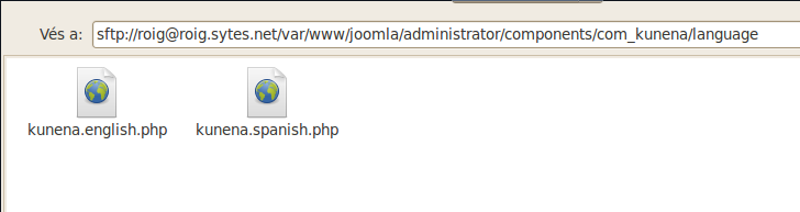 Descomprimim i busquem l'arxiu "kunena.spanish.php" que es troba en "espanol_k1.5.X-unzip1st/administrator/components/com_kunena/language/kunena.spanish.ph" i el putjem al nostre servidor al directori am la mateixa ruta que el arxiu descarregat (/administrator/components/com_kunena/language) al meu cas (/var/www/joomla/administrator/components/com_kunena/language):