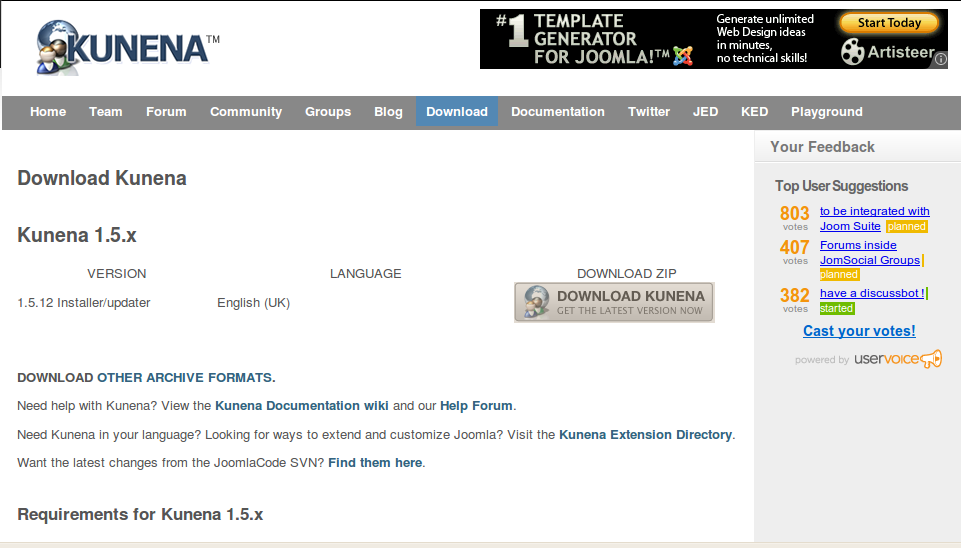 - Elegim la versio i la descargem, en aquest cas, Kunena 1.5.x i fem clic al botó (DOWNLOAD KUNENA GET THE LATEST VERSION NOW ):