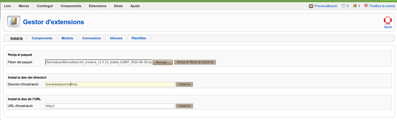 Des del Tauler de Control del nostre joomla anem a "Extensions-->Instal·la/Desinstal·la":