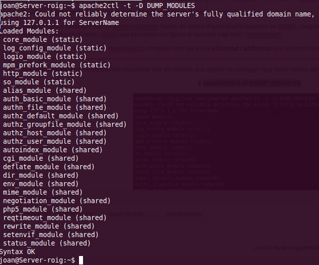 A través d'aquesta comanda podrem visualitzar tots els mòduls que apatxe va carregar i que estan llestos per ser utilitzats.